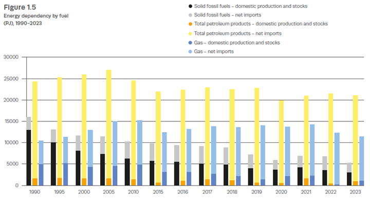 Ilustración 1. Dependencia energética por combustible fósil (PJ), de 1990 a 2023. Fuente: EBA (2025).