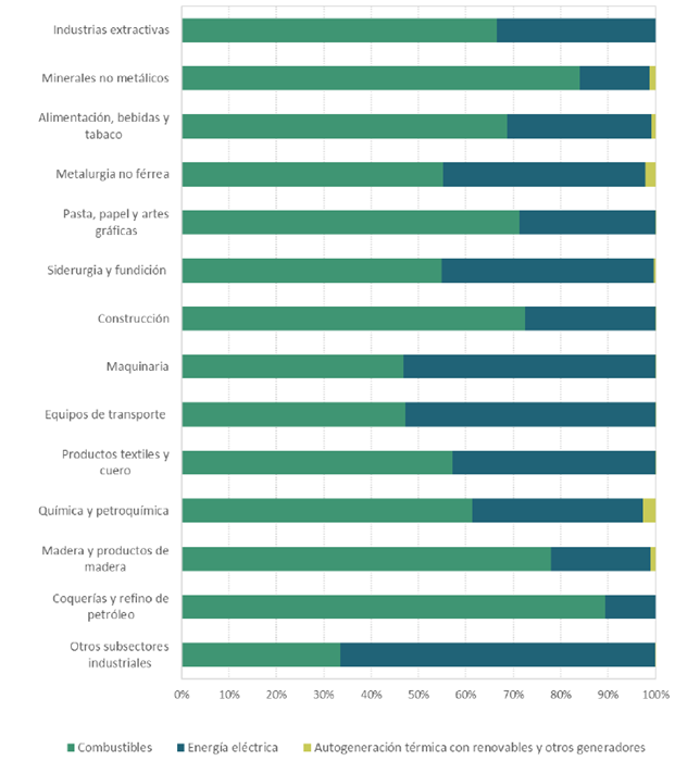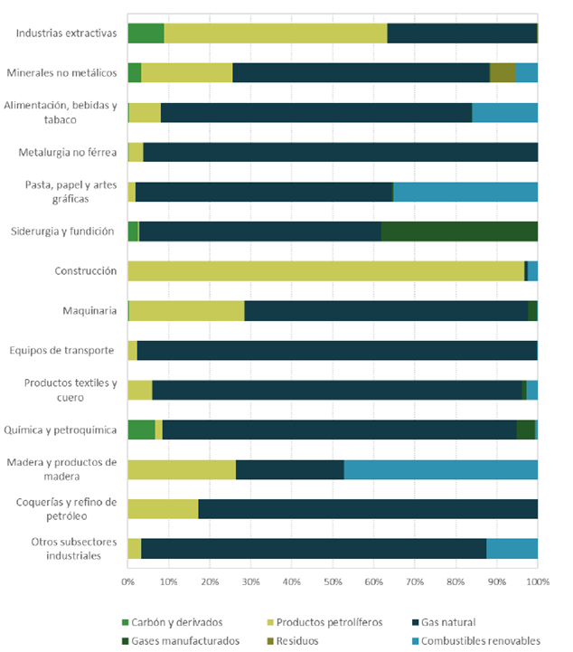 De nuevo, la variación entre subsectores industriales es sustancial. El 86,3 % del consumo de los combustibles renovables se concentra en los sectores de la pasta, papel y artes gráficas (36,0 %), alimentación, bebidas y tabaco (29,6 %) y madera y productos de la madera (20,7 %). Por su parte, los subsectores de las industrias extractivas, construcción, o maquinaria apenas presentan uso de combustibles renovables y presentan un consumo superior a la media de productos petrolíferos. Estas diferencias sectoriales muestran qué subsectores industriales afrontan mayores retos para la descarbonización.