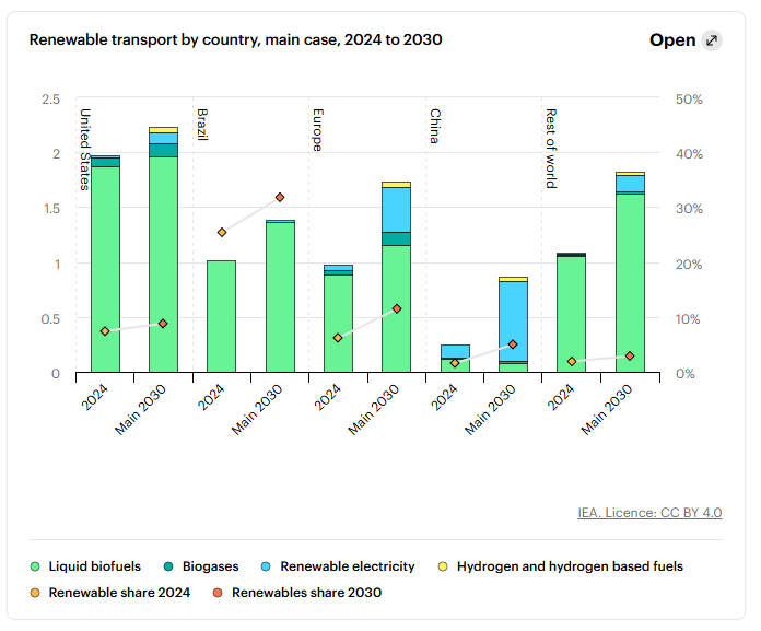 El consumo de energías renovables en el transporte —incluyendo electricidad, biocombustibles líquidos, biogás e hidrógeno renovable— se espera que aumente un 50 % para 2030, impulsado principalmente por la electrificación del transporte por carretera, que representará el 45 % de este crecimiento, especialmente en China y Europa. Los biocombustibles líquidos contribuirán con un 35 %, con un aumento significativo en Brasil, Indonesia, India y Malasia, gracias a mandatos más estrictos y la creciente demanda de combustible. El transporte aéreo y marítimo aportará un 10 % del crecimiento, mientras que el 10 % restante provendrá de biometano e hidrógeno renovable, concentrado en Estados Unidos y Europa.