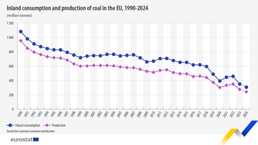 En 2024, la producción y el consumo de carbón en la Unión Europea descendieron a sus niveles más bajos desde que existen registros, situándose en 242 millones de toneladas y 306 millones de toneladas, respectivamente. En comparación con 2023, el consumo se redujo un 13 % y la producción un 12 %. La caída interanual ya había sido especialmente acusada entre 2022 y 2023, cuando la producción disminuyó un 21 % y el consumo un 23 %.