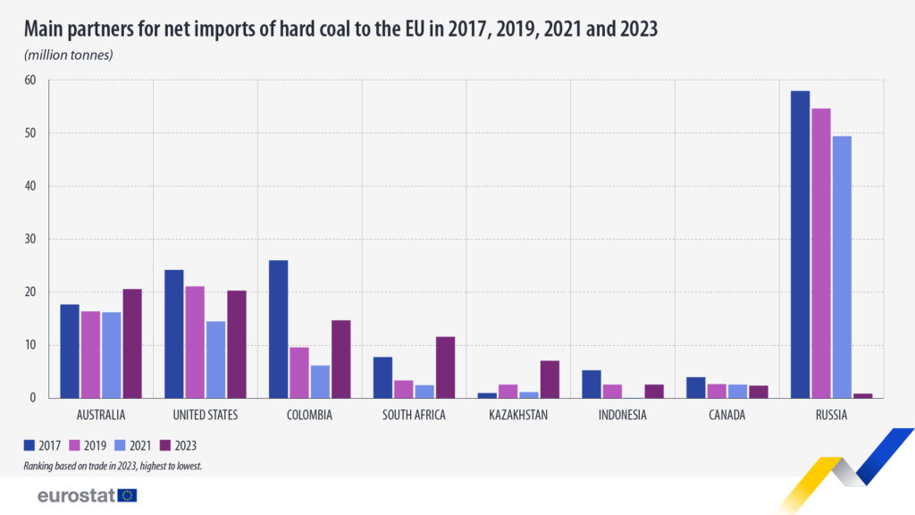 En los últimos años, la UE ha experimentado una fuerte reconfiguración de sus principales proveedores de carbón. Entre 2021 y 2023, las importaciones netas de carbón duro desde Rusia se redujeron un 98 %, como consecuencia de la prohibición impuesta por la UE a partir de agosto de 2022, tras la invasión rusa de Ucrania.