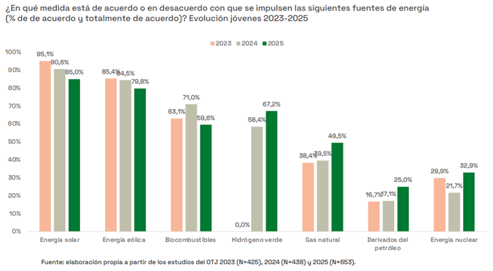 En este contexto, el porcentaje de jóvenes que están de acuerdo con que se impulsen diferentes fuentes de energía renovable ha variado significativamente entre 2023 y 2025. Aunque el respaldo a tecnologías como los biocombustibles, la energía solar y la eólica sigue siendo muy superior al de las fuentes derivadas del petróleo, en el último período el apoyo a las renovables desciende frente a un pequeño aumento del apoyo a las energías fósiles.